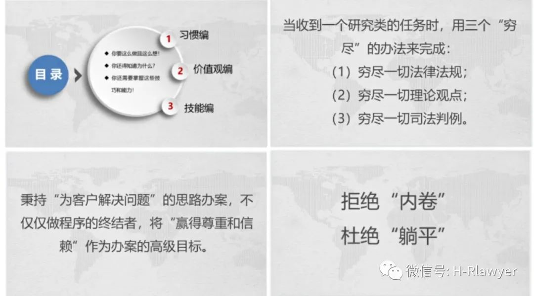 在7月27日下午的第六期“空中讲堂”上,合睿所王鹏律师区分习惯编、价值观编、技能编三个层次,依次分享了青年律师应当养成的职业信念、个人形象、工作热情等10个好习惯;应该践行的传帮带、注重德行、尊师重道等10种价值取向;执业必备的扎实可靠的法律功底、得心应手的协作能力、见微知著的领悟能力等15种技能。