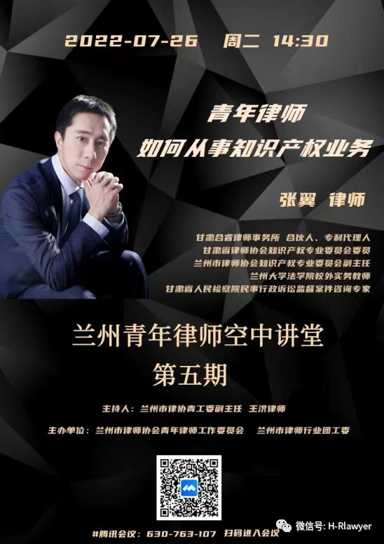 2022年7月26日下午,由兰州市律师协会青年律师工作委员会主办的兰州青年律师空中讲堂第五期“青年律师如何从事知识产权业务”在腾讯会议线上开讲。本次专题讲座由兰州律协青工委副主任王济律师担任主持,甘肃合睿律师事务所合伙人张翼律师担任主讲。