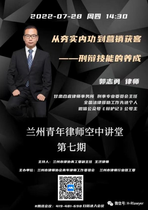2022年7月28日下午,由兰州市律师协会青年律师工作委员会主办的兰州青年律师空中讲堂第七期《从夯实内功到营销获客——刑辩技能的养成》在腾讯会议线上开讲。本次专题讲座由兰州律协青工委副主任王济律师担任主持,甘肃合睿律师事务所刑事专业委员会主任郭志勇律师担任分享人。