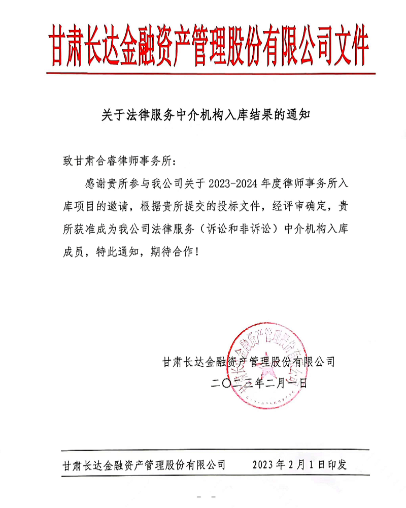 2023年2月,甘肃合睿律师事务所成功入围甘肃长达金融资产管理股份有限公司法律服务中介机构备选库。