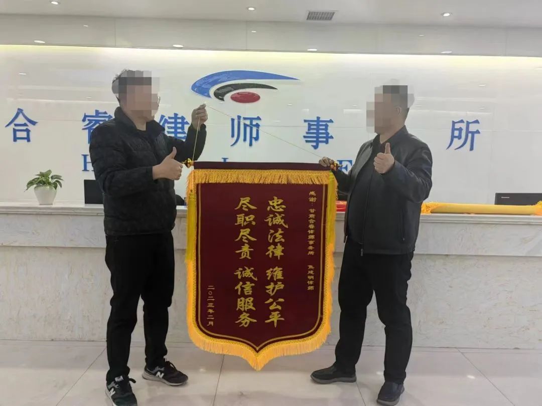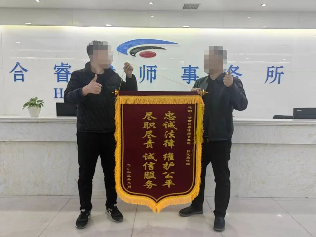2023年2月24日,两名委托人在接到其亲属均获缓刑的刑事判决后,将印有“忠诚法律、维护公平、尽职尽责、诚信服务”的两面锦旗分别送到了甘肃合睿律师事务所郭志勇律师、焦建明律师手中,以感谢两位律师提供的专业和卓有成效的刑事辩护。