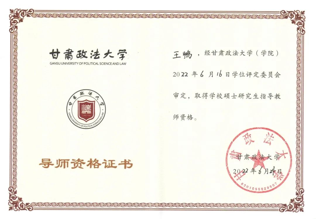 通过个人申请、律所同意、专家推荐、学院审核、学校研究生处审查,最终经甘肃政法大学2022年6月16日学位评定委员会审定、校内公示等流程,王鹏律师取得甘肃政法大学硕士研究生指导教师资格,同年11月16日,王鹏律师被聘任为甘肃政法大学第十七批实务导师。