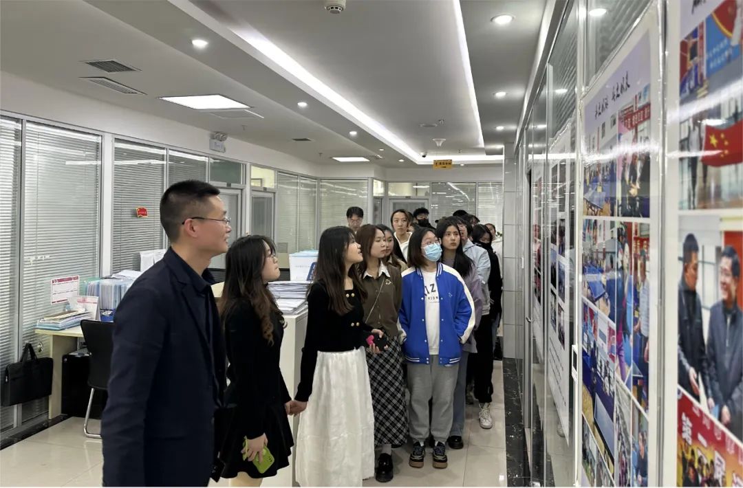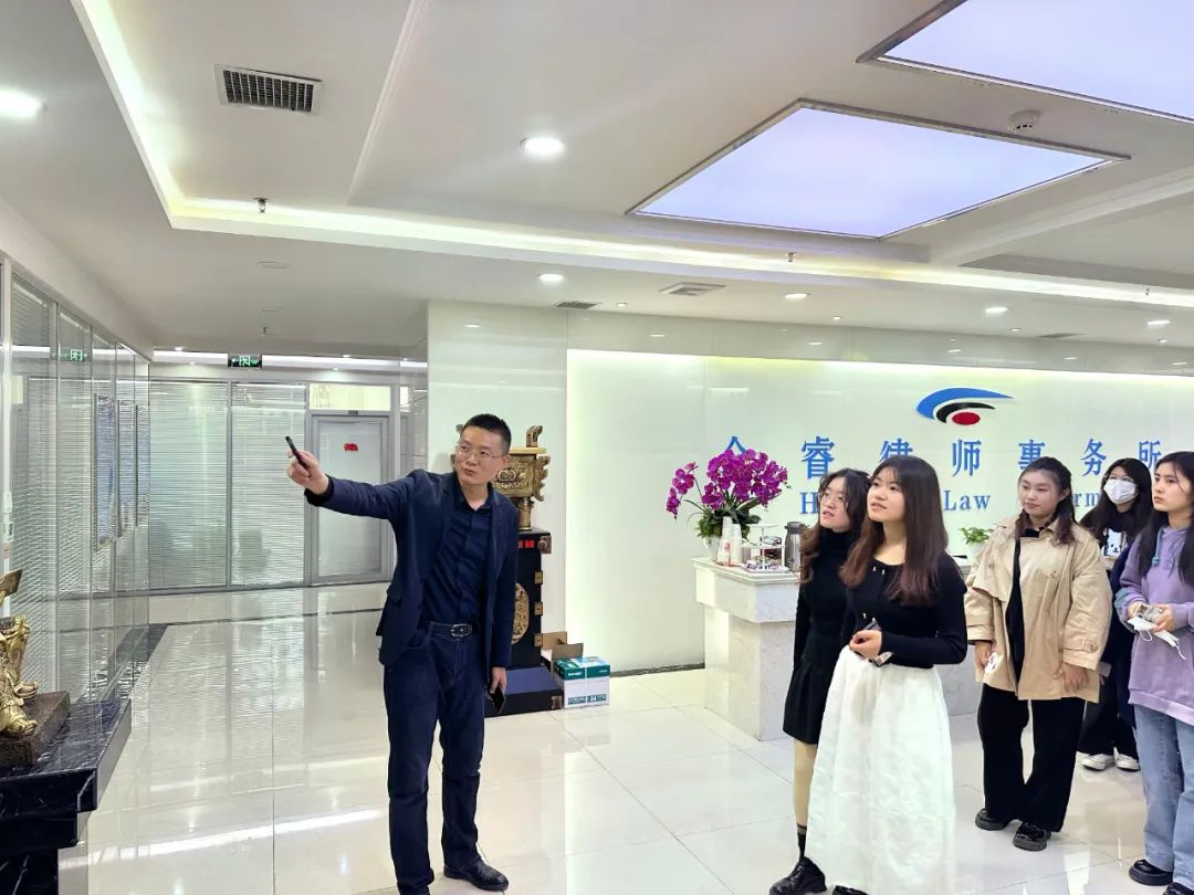 在王鹏律师的带领和讲解下,同学们参观了合睿律所内部办公环境及重要功能区域,包括律所文化墙、荣誉墙、照片墙、接待室、党员活动室、办公区等。王鹏律师向同学们介绍了合睿律所的发展历程,并向同学们重点阐释了“合众之睿,服务社会,努力做最受尊敬的律师”的文化核心理念,同学们深切地感受到了合睿律所旺盛的生命力和积极向上的文化精神。