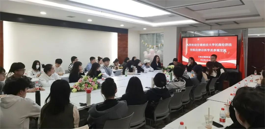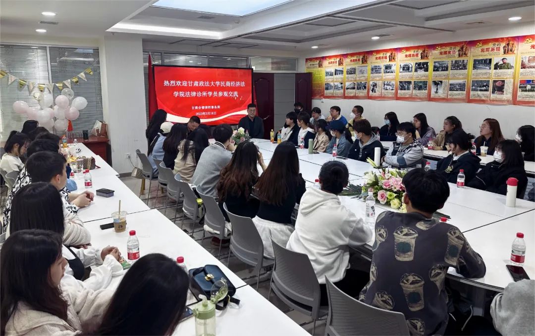 2023年3月18日下午,甘肃政法大学民商经济法学院第22期、第23期民事法律诊所学员近50人在苏婷婷老师的带领下前往我所进行了参观交流,合睿鹏团律师与同学们进行了近距离地接触与交流。