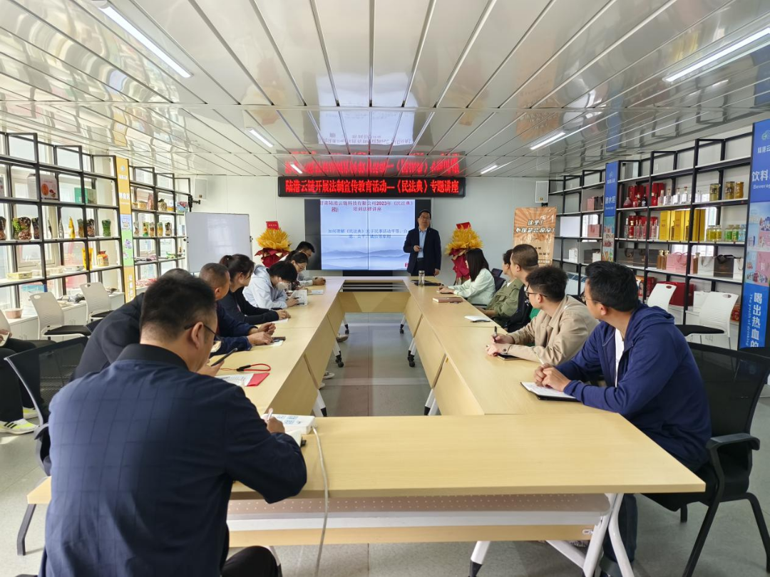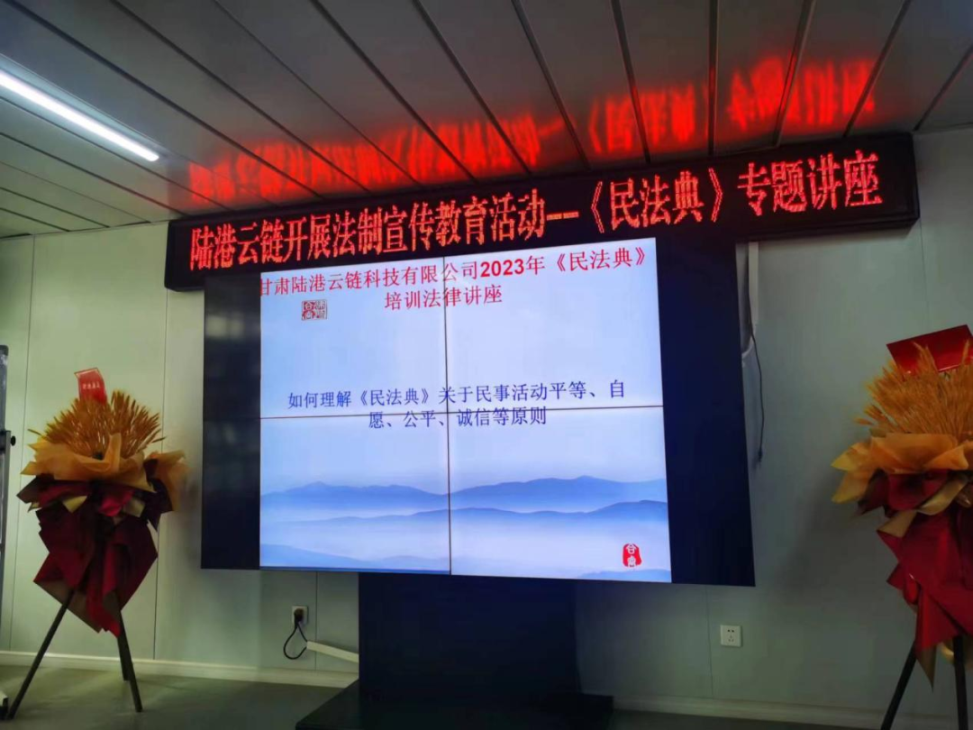 为增强广大干部职工的法治观念,进一步推动依法治企工作深入开展,做好公司“八五”普法宣传教育工作,2023年5月26日,陆港云链公司开展2023年法制宣传教育活动《民法典》专题讲座,特邀公司法律顾问——甘肃合睿律师事务所资深律师武启波主讲。公司全体员工参加了讲座。