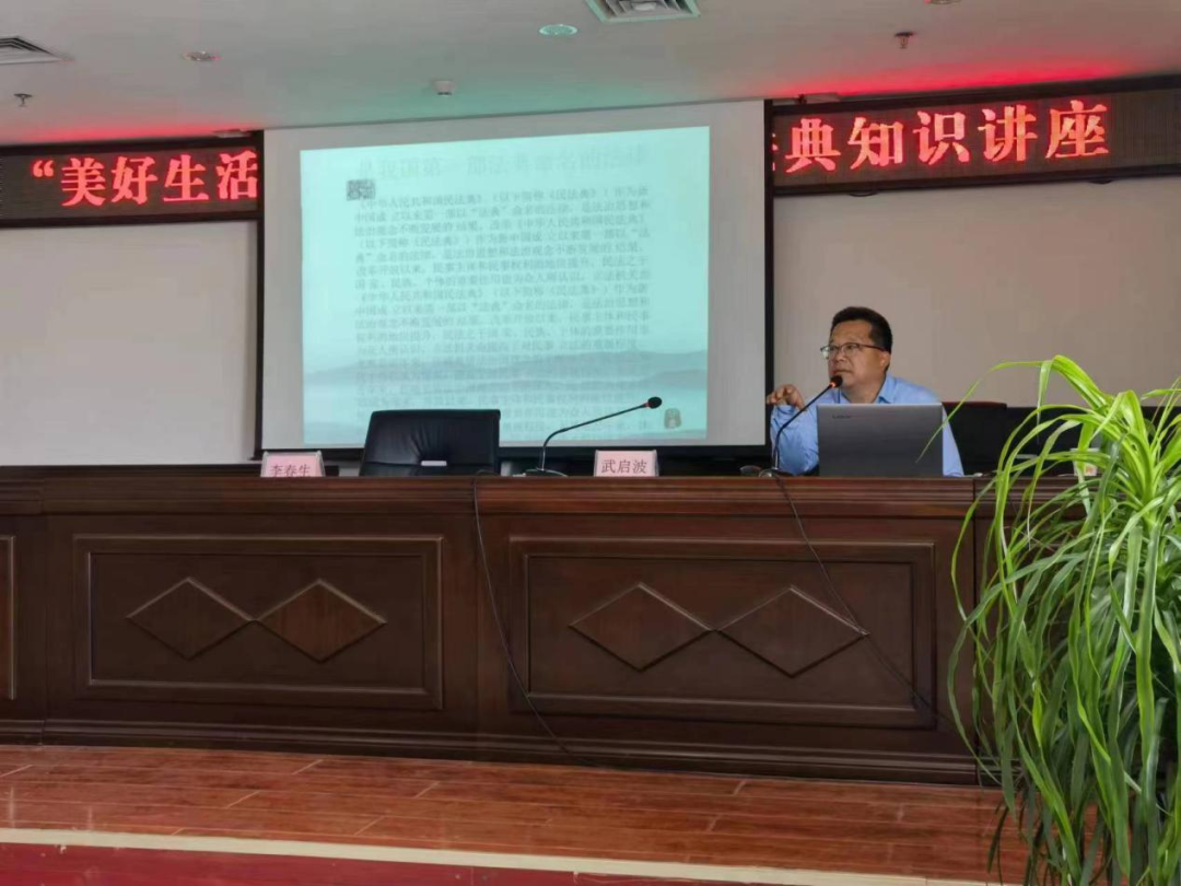 甘肃省物产集团兰州物流园有限公司五月份开展《中华人民共和国民法典》宣传月活动,为增强广大干部职工的法治观念,进一步推动依法治企工作深入开展,做好公司“八五”普法宣传教育工作,特邀公司法律顾问——甘肃合睿律师事务所资深律师武启波同志,于2023年5月26日下午为公司全体员工,开展“美好生活.民法典相伴”民法典知识讲座。