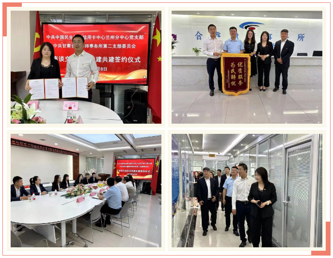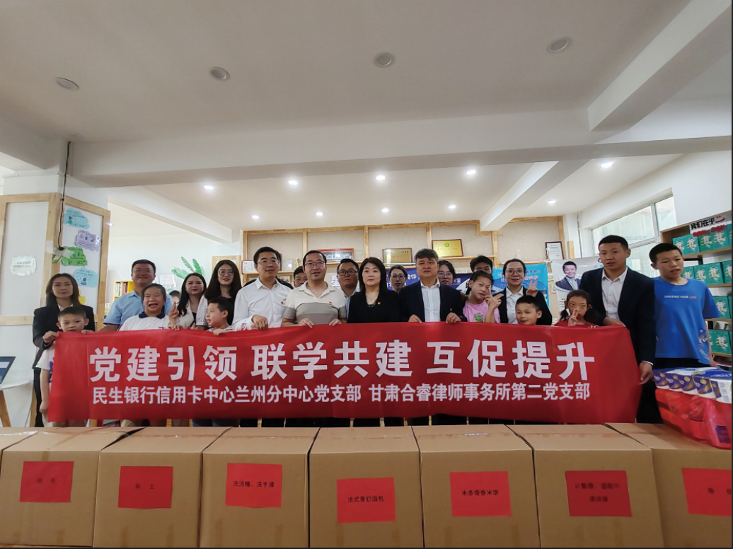 活动中,民生银行信用卡中心兰州分中心党支部支部书记武翠征、副书记张少华一行在甘肃合睿律师事务所第二党支部书记郑宝鹏同志的陪同下来到甘肃合睿律师事务所进行了党建工作观摩交流,并在党建活动室组织开展了党建共建签约仪式,双方就深入党建互联共建的内容、形式进一步达成共识,将从共筑组织基础、共促队伍建设、共营核心文化、共建联系制度、共享资源优势等方面开展互联共建,组织党员更多参与社会基层服务、解难帮困群众、助力企业发展等。随后,双方共同前往兰州凡尘安星特殊教育中心为孩子们送去爱心。