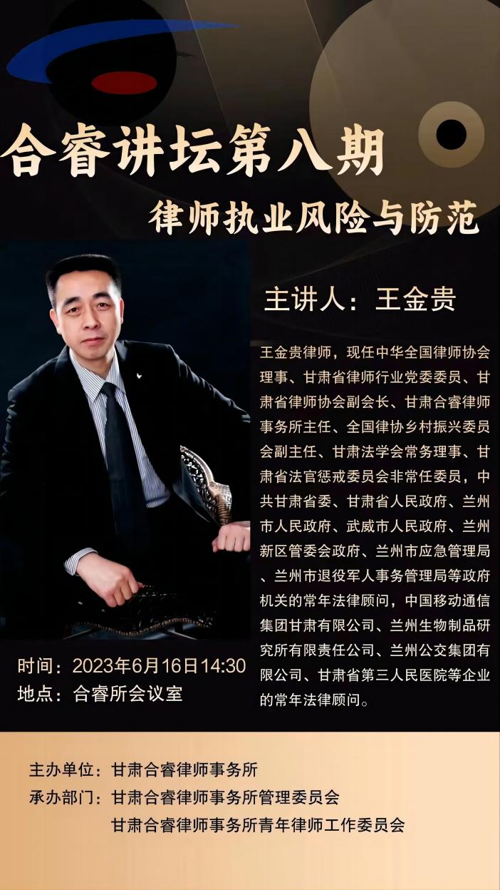 为加强合睿所青年律师队伍建设,搭建青年律师沟通交流平台,增强青年律师执业风险防范意识,帮助青年律师规避执业风险。2023年6月16日下午,由合睿所主办,律所管委会、青委会承办的合睿讲坛第八期交流活动在律所会议室隆重举行。律所主任王金贵为青年律师作了主题为“律师执业风险与防范”的专题讲座,合睿所全体青年律师参加了此次活动。