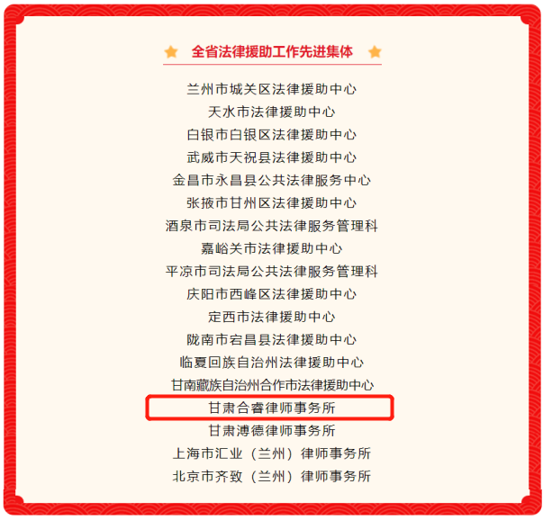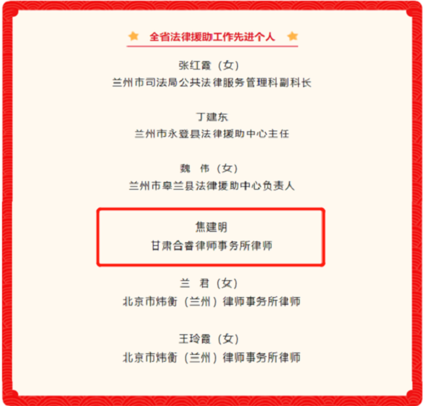 近日,在甘肃省司法厅印发《关于通报表扬全省法律援助工作先进集体和先进个人的决定》中,甘肃合睿律师事务所荣获全省法律援助工作先进集体、合睿所焦建明律师荣获全省法律援助工作先进个人荣誉。