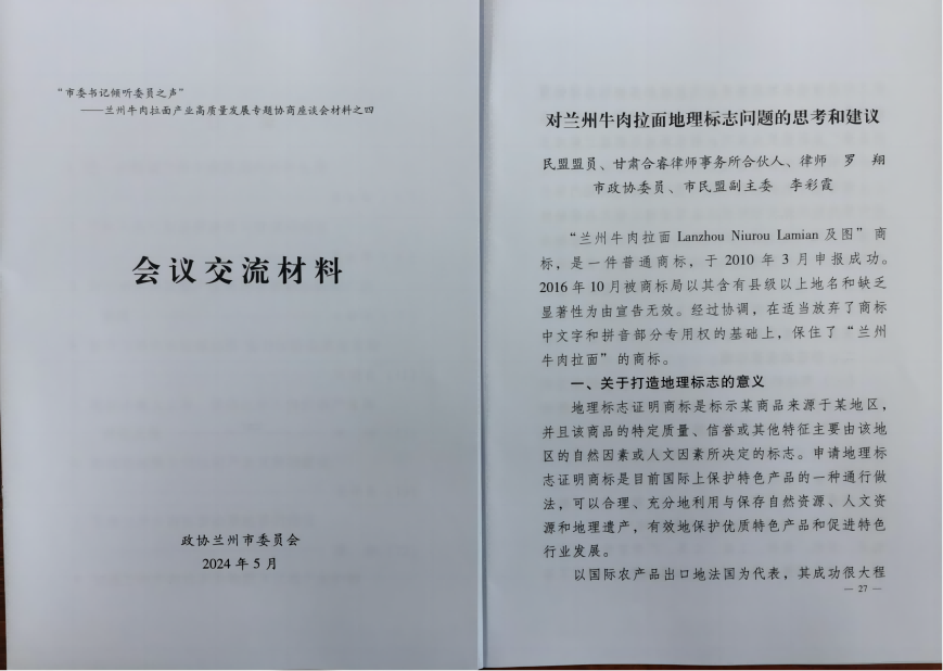甘肃合睿律师事务所罗翔律师的《对兰州牛肉拉面地理标志问题的思考和建议》建言,入选会议交流材料并应邀参加会议,得到与会领导的一致肯定。