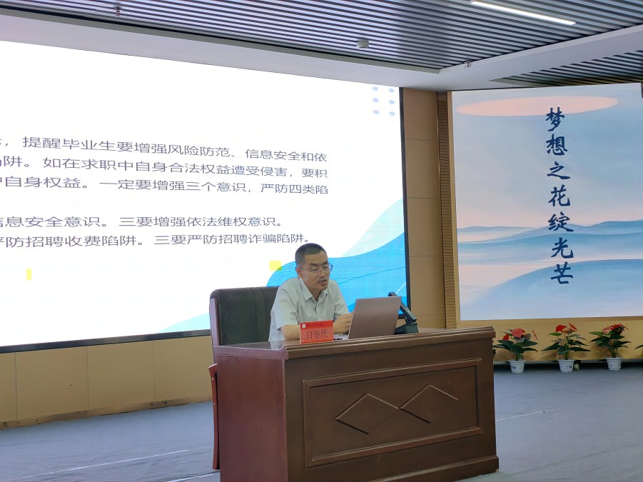 讲座期间,白春民律师首先立足于毕业生求职视角,向同学们详细解读了求职就业过程中容易遇见的法律风险问题,讲授了求职中有可能遇见的违规违法情况,提醒大家在求职过程中要务必擦亮双眼,增强风险防范意识、增强信息安全意识、增强依法维权意识,要严防非法职业中介陷阱、严防招聘收费陷阱、严防招聘诈骗陷阱、严防“猫腻”合同陷阱。如在求职中自身合法权益受到了侵害,要敢于积极收集并留存有关证据,用法律维护好自身合法权益。