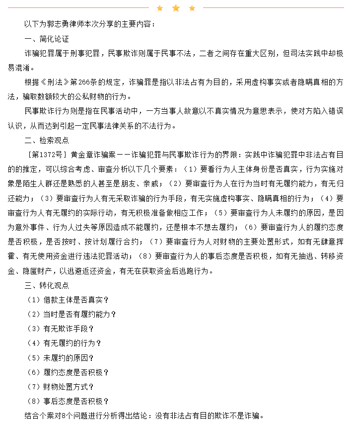 在活动中,甘肃嘉乐律师事务所金芙蓉律师分享《刑事案件涉财产辩护的思考》、甘肃佳运律师事务所高付华律师分享《非法经营烟草制品案的定罪之争》、北京德恒(兰州)律师事务所杨兆昌律师分享《认罪认罚从宽制度下如何有效辩护》、武丹彤律师分享《侵犯公民个人信息案件的有效辩护》,我所郭志勇律师分享《如何界分刑事诈骗与民事欺诈》。西北师范大学党崇武副教授点评发言、西北师范大学赵姗姗副教授作《非法经营(涉烟)的实体难点》发言、兰州市七里河区人民检察院郭春刚检察官作《检律共情共事》发言、兰州市城关区人民检察院张巨鹏检察官作《办理追诉核准案件要点》发言、西北政法大学李其瑞教授点评发言。最后,兰州市法学会秘书长张宸苓调研员总结发言。