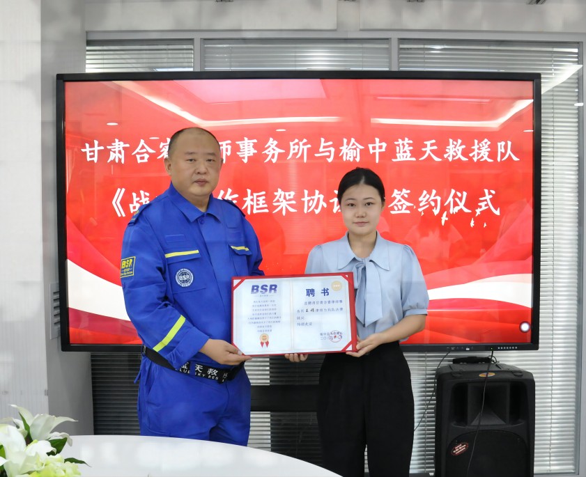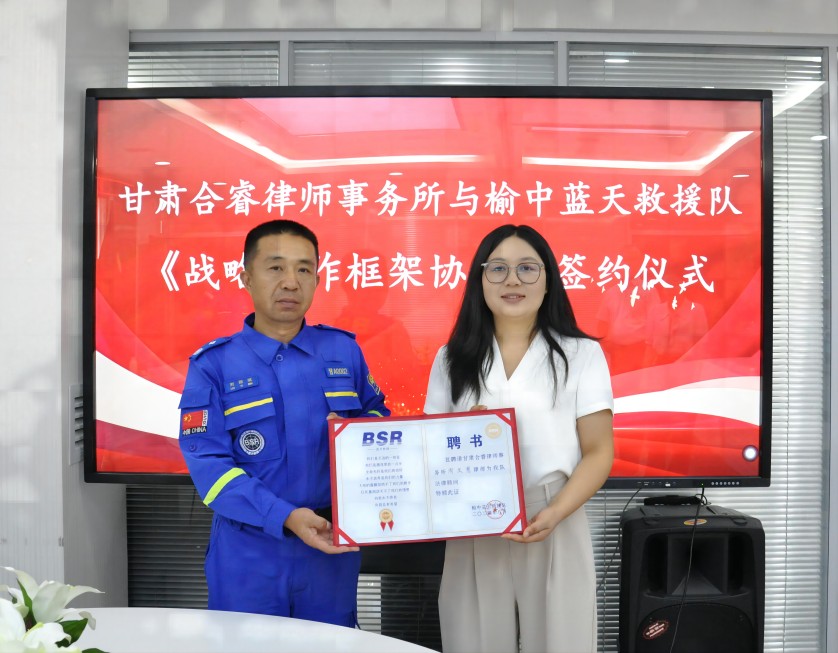 2024年8月14日上午,榆中蓝天救援队与甘肃合睿律所事务所正式签署《战略合作框架协议》,聘任合睿律所王济、周文慧、王娟律师为榆中蓝天救援队法律顾问,为榆中蓝天救援队提供法律服务,与榆中蓝天救援队携手前行,用法律的力量守护公平与正义,为社会的进步贡献一份心力。