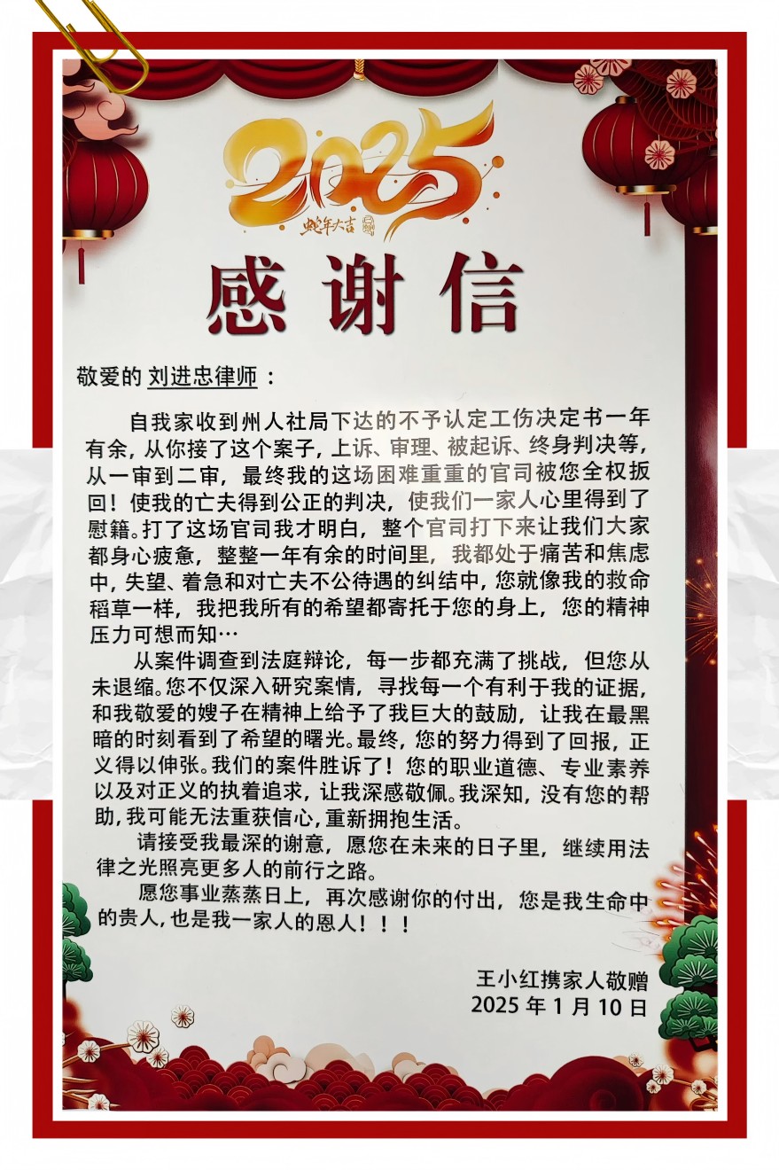 近日,我所刘进忠律师不忘初心,牢记使命,在处理一起棘手的工伤认定案件中,依法捍卫了因公殉职检察官及其家属的合法权益。