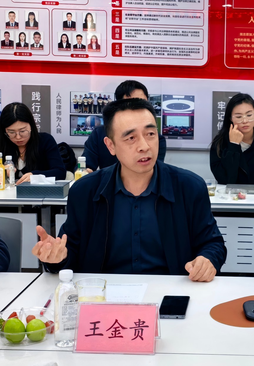 随后,合睿律所王金贵主任发言。王主任提到,青年律师需勇于突破自我,积极推广律所及个人品牌,塑造正面形象,同时传承律所文化,虚心向前辈求教,持续提升专业能力与职业素养。王主任还鼓励青年律师要有长远规划与开阔视野,为职业生涯制定长期规划,以便在竞争激烈的法律行业中脱颖而出。
