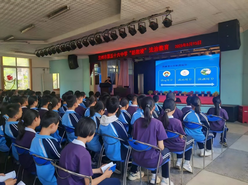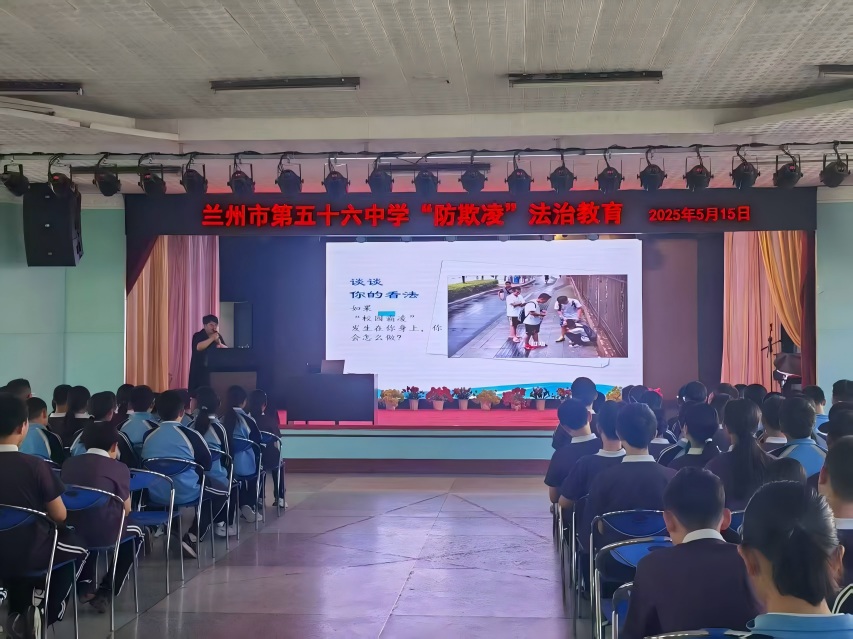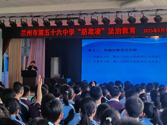 2025年5月15日下午,甘肃合睿律师事务所孙艳红律师与城关区铁路西村司法所携手,走进辖区内的兰州市第五十六中,为三百余名初一年级学生开展了以"民法典进学校 拒绝校园暴力"为主题的“防欺凌”法治宣传活动。