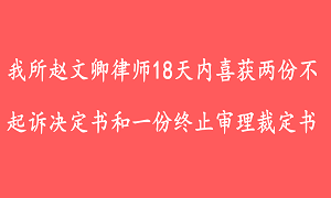 我所赵文卿律师18天内喜获两份不起诉决定书和一份终止审理裁定书