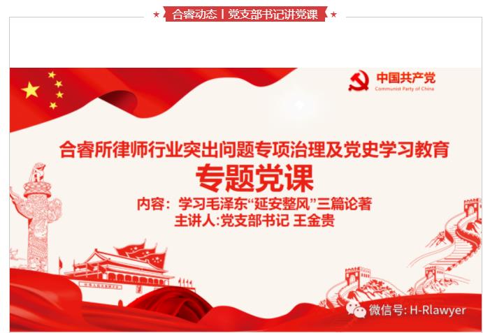 为贯彻落实习近平总书记在党史学习教育动员大会的重要讲话精神,根据兰司教整办《全市律师行业突出问题专项治理学习教育阶段实施方案》及兰州市律师行业党委《关于开展党史教育的实施方案》,2021年4月16日,合睿所党支部书记王金贵为全体党员律师讲党课,学习毛主席“延安整风”三篇论著、“四史”。