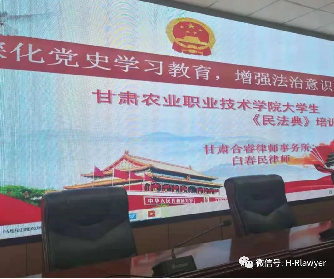 2021年5月26日下午,甘肃农业职业技术学院邀请甘肃合睿律师事务所白春民律师做了《深化党史学习教育,增强法制意识,甘肃农业职业技术学院大学生民法典培训》的法律专题讲座。甘肃农业职业技术学院200多名大学生参加了法律讲座,通过本次培训希望大学生们在校园生活中和以后走向社会要学会运用法律保护自己,本次培训取得了良好效果