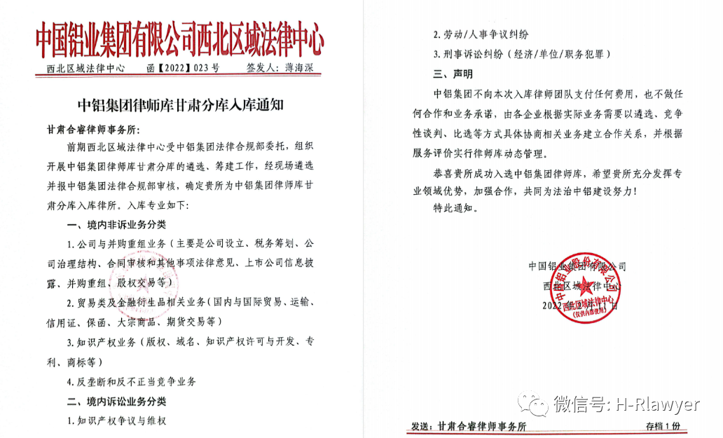 2022年2月11日,甘肃合睿律师事务所经中铝集团法务合规部审议,入选中铝集团律师库甘肃分库。入库律师服务专业分别是:知识产权诉讼与非诉业务、公司并购重组非诉业务、金融贸易非诉业务、反垄断与反不正当竞争非诉业务、劳动人事诉讼业务、刑事诉讼业务。
