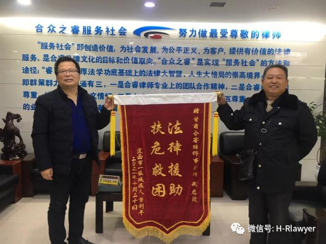 2021年12月1日上午,朗清气正暖阳普照。合睿律师事务所又开始了一天的忙碌。定西市一级残疾人董某某委托甘肃12316三农服务热线政策法规专家李学荣老师,为甘肃合睿律师事务所武启波律师送来了锦旗,上写“法律援助,扶危救困”八个大字。