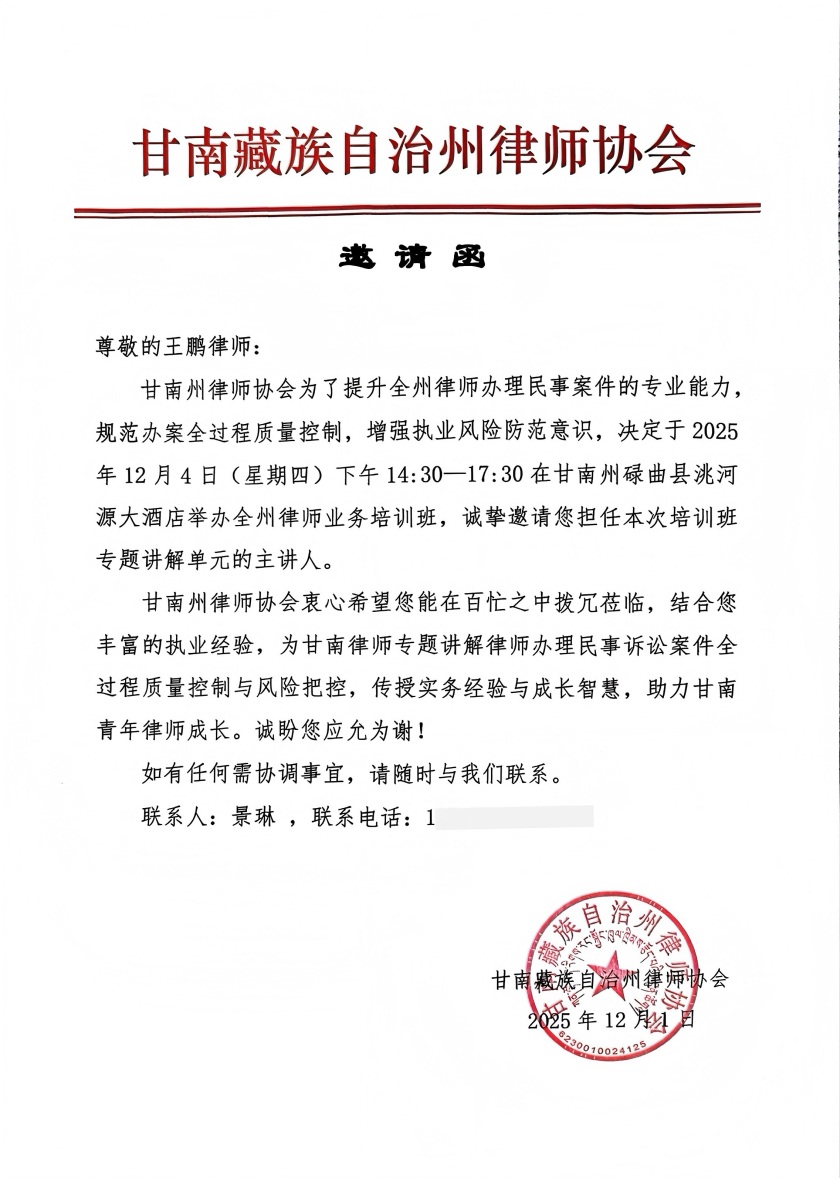 2025年12月4日下午,正值第十二个国家宪法日,甘肃合睿律师事务所合伙人王鹏律师,应甘南藏族自治州律师协会之邀,在第十二个国家宪法日碌曲县系列活动暨全州律师培训学习会上作了题为《民事诉讼全过程质量控制与风险把控要点》的专题讲座。甘南藏族自治州各县司法局及法律援助中心工作人员、全州执业律师及实习律师等共同参与了交流学习,培训会由甘南藏族自治州律师协会会长李平主持。
